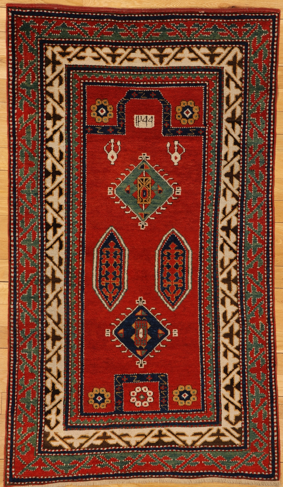 This longer than classic southwest Caucasian prayer rug shows a characteristic madder red field with a squared re-entrant below and a faceted niche above.There are two hexagonal navy and red cartouches,two fringed diamonds in green and navy,three yellow and white rosettes below and two yellow in the spandrels and two ivory ewers.The doubled main borders show an inner complex reciprocal in ivory and black,and an outer red and green.The innermost border hosts a zigzag in red and green.There are six red and white barber pole lines and four solid navy lines in the border system.At the top end is a red flatwoven band sewn over.All the colors are from natural sources.The piece is in good condition.