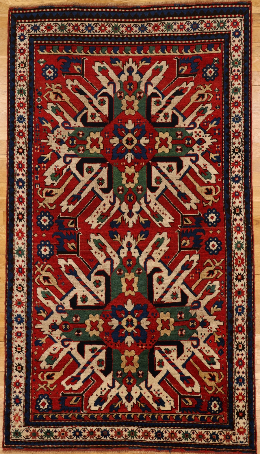 The tomato red field of this striking Kazak rug shows two powerful radiating eagle medallions in ivory with green cruciform centers.At the center of each medallion is a red,dark blue and ivory motif surrounded with dots.Scattered about are rosettes,X’x and tiny diamonds.At each end of the red field is a yellow comb with colorful one way bird heads.The ivory main border shows connected colorful stars and is flanked by blue and black triangle reciprocal minor borders.There are four barber pole lines in the border system.At each end is a madder red plainweave band.All the colors are from natural sources.The selvedges are original and intact.This attractive piece is in good pile and condition.