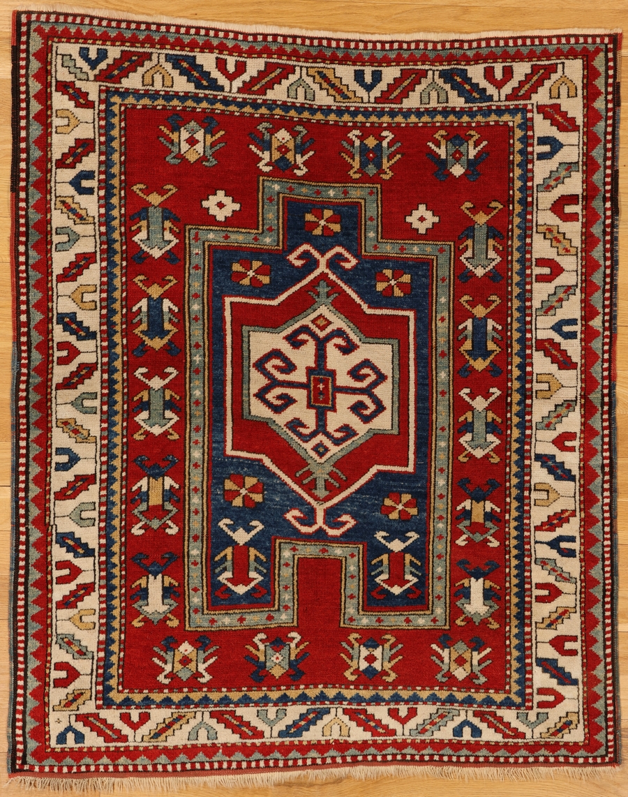 This iconic south Caucasian prayer rug shows a rich madder red field decorated with stylized bugs,and displaying a dark blue niche and a re-entrant sub-field.At the center is an ivory cartouche embedded in a conforming red medallion.Additionally in the sub-field are rosettes and more stylized bugs.The sub-field is edged by a teal band.The ivory slant leaf and chalice border is flanked by red and blue and yellow and blue triangle reciprocals.There are four barber pole lines in the border system.At the bottom end is a red flatwoven finish.Square format makes this prayer rug especially attractive.All the colors are from natural sources.The piece is in good condition.SOLD