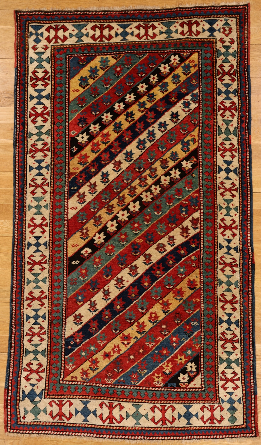 This south Caucasian rug shows classic Gendje pattern of diagonal stripes in shades of red,shades of blue,ivory,green and black in addition to a vibrant yellow.The stripes are uniformly patterned with palmettes with star like flowers.The tertiary decor includes lazy S’s and diamonds.The unusual ivory main border shows hooked motifs separated by stylized crosses in various colors.The inner secondary border displays a keyhole reciprocal in red and green.The outer minor border hosts reciprocal triangles in red and blue.There are four barber pole lines in the border system.The wool is exceptionally soft and lush and has taken the dyes extremely well.The red and blue selvedges are original and intact.All the colors are from natural sources.The handle is meaty and chunky.The piece is in good pile and condition.