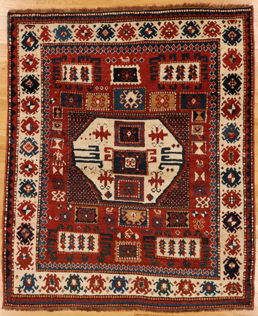 This unusual dated Karatchoph Kazak rug shows an ivory border with floating bug pattern tonally en suite with the octagonal medallion and the four corner boxes with merged stars.In the medallion are three stacked and nested rectangles along with long hooks,a date and stylized stars.In the red field are several additional rectangles,a human figure and animals.Along the outer edge of the field is a keyhole reciprocal surrounding the red ground.The outer minor border displays reciprocal triangles and there are red and yellow and red and ivory narrow barber pole lines in the border system.The size is square,the pile is high and the wool is soft.All the colors are from natural sources.The piece is in good pile and condition.SOLD