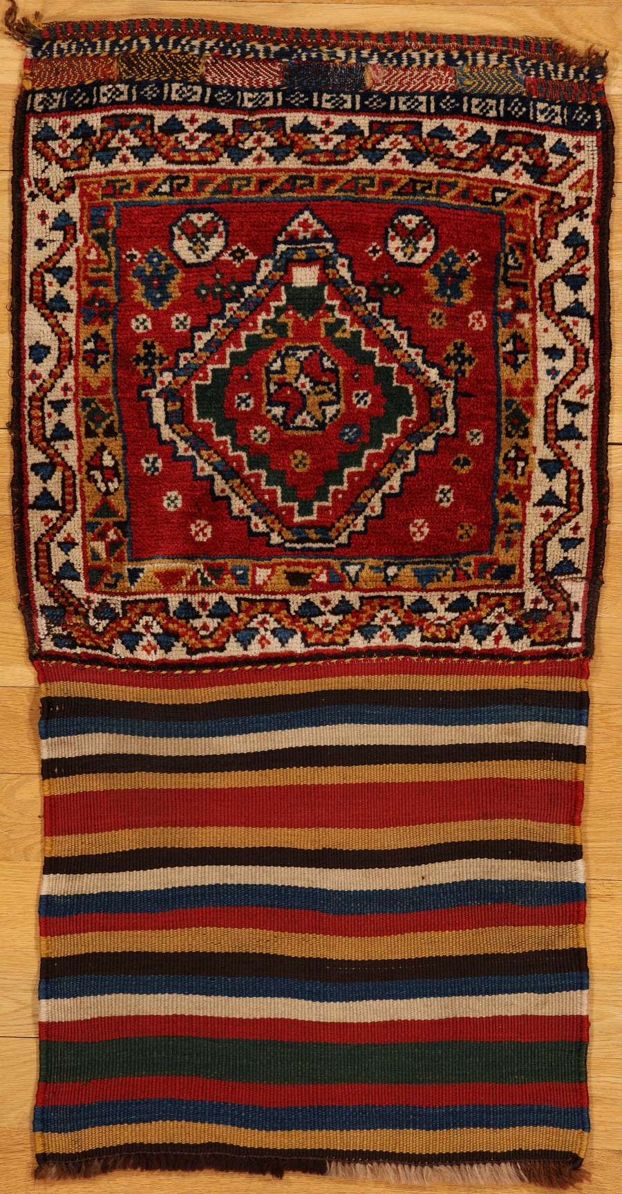 The tomato red permeates both the field and the stepped diamond medallion which is centered by a multicolor star.In the corners are ivory octagons or lesser rosettes.In the field and in the medallion are small quincunx rosettes.The medallion has an inner barber pole stripe.The ivory main border shows a red and yellow meander with decorative triangles.There is a yellow innermost band with rosettes and botehs.At one end is a navy and ivory checkerboard line followed by colorful soumak closure tabs and finally a weft float strip.The back is colorfully striped with ivory,red,yellow,green,navy and dark brown.All the colors are from natural and vegetable sources.The wool is soft and of high quality.The piece is in good pile and condition.