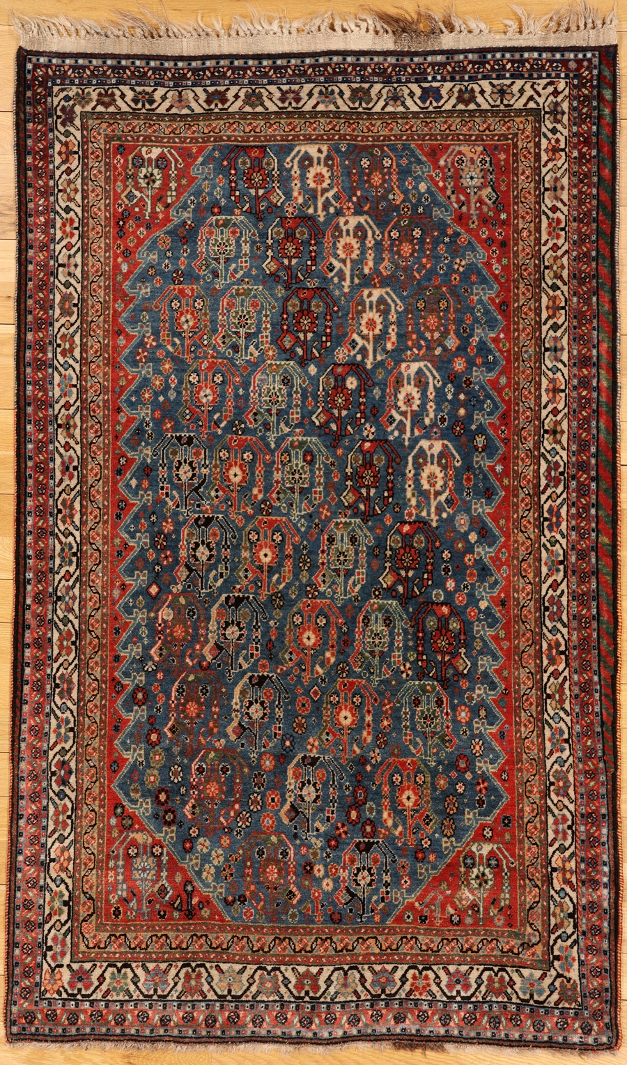 The blue field hosts a diagonal pattern of open floriated stylized botehs in red,ivory,blue,black and yellow.The red corners all display stylized botehs and the red sides display a floral wave patterns.In the sides and the field are small rosettes in various colors.The ivory main border shows a classic Qashqai meander and reversing palmette pattern.The minor borders in red and peach employ rosettes and meanders.There are four tertiary narrow borders with different patterns.The outermost striped border varies in with the lower right corner.It is partially narrow,an irregularity sought after by connoisseurs.At the top end is a beige flatwoven band followed by knots and the sides are in red and yellow and blue and rose.All the colors are from natural sources.The wool is soft and the handle is pliable.The piece is in good pile and condition.