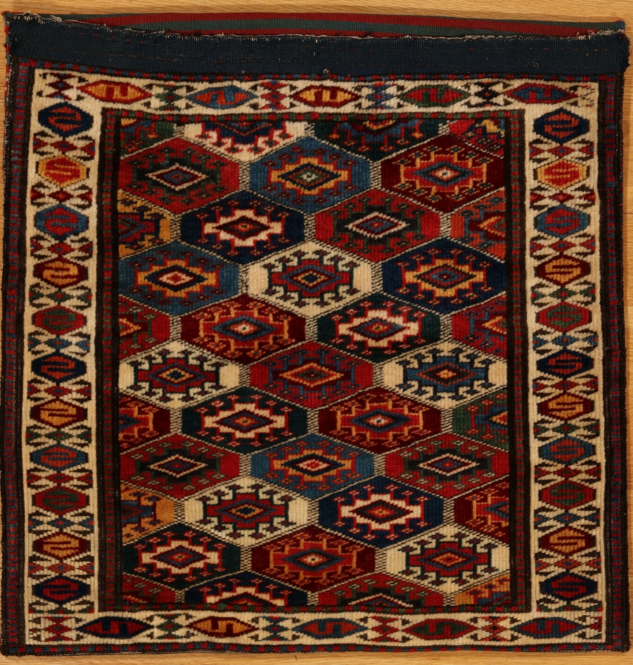A reverse soumak pattern has been translated into pile in this highly unusual piece.The field is totally connected by a flattened hexagonal tile pattern in which stepped lozenges in blue,red,ivory,navy,yellow and burgundy are set on reserves in the same colors.The ivory main and only border shows connected hexagons enclosing S’s in various colors.There are two barber pole narrow lines in red and blue in the border system.At one end is a wide dark blue flatweave.The plainweave back is equally striped in red and blue.The wool is soft and the pile is high.All the colors are from natural and vegetable sources.The piece is in good condition.